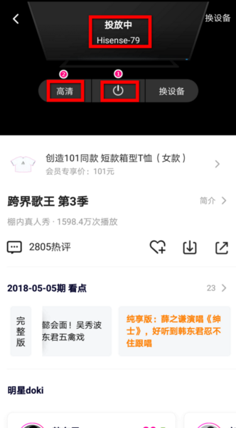 8、在投放连接过程中,如果点击图示1位置的图标的话就可以关闭投放,如果对默认的清晰度不满意的话,可以点击图示2位置的【高清】选项。