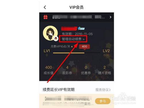 2、在我的VIP会员界面中,可以看到一些简单的信息,有效期、等级成长状态条、成长值等等,在该界面中,点击“管理自动续费”,如图中箭头所示;