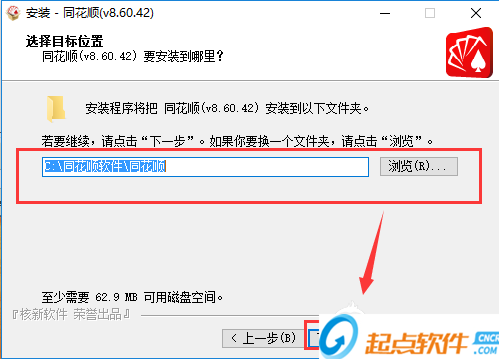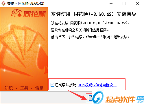 1、双击下载的安装包,打开同花顺安装向导,查看后勾选【同花顺软件使用协议】,单击【下一步】