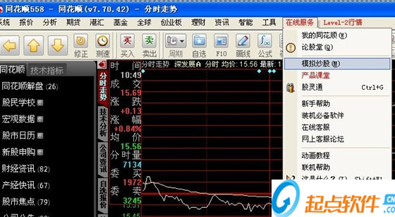 1)70之前的版本(包括70版本)点击菜单栏中的“在线服务”,选择“模拟炒股”;80版本点击菜单栏“理财”,选择“模拟炒股”