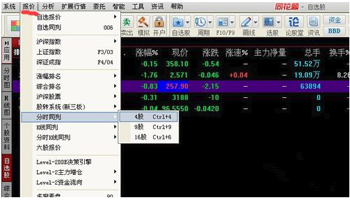 如果想看,多支股票的分时图,同时展现出来,那么点击左侧上的“报价”按钮,在列出的菜单中,点击“分时同列”,可以选择4,6,9股不等
