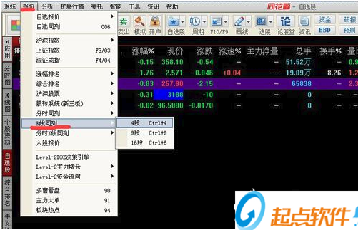 如果打算看多只股票的k线图,那么可以点击左上方的“报价”按钮,然后选中“k线同列”,然后选择股票的数目