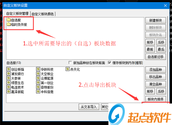 b.选中所需要导出的(自选)板块数据,这里也可以将板块股数据或者其他股票数据进行导出。