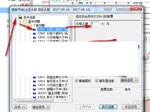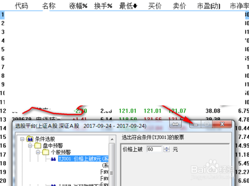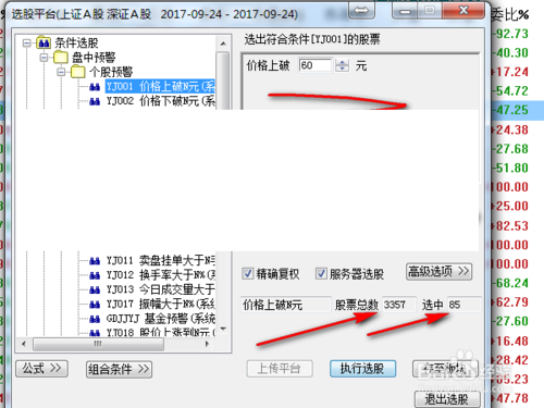 例如我们想找出今天价格向上突破了60元的股票,我们就可以一次选择条件选股——盘中预警——个股预警——YJ001。在右边的参数选项中输入60.