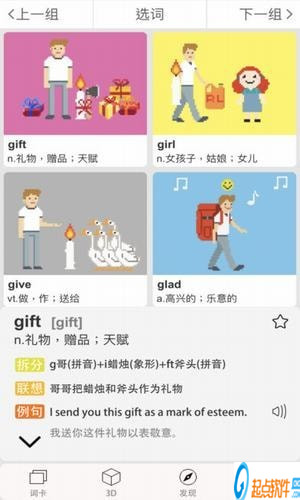 想像单词结合记忆法,为每个单词精心绘制了联想画面,并制成词卡。通过联想和画面,调动左右脑,能迅速牢记单词。