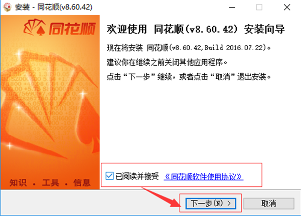 1、双击下载的安装包,打开同花顺安装向导,查看后勾选“同花顺炒股软件使用协议”,单击“下一步”