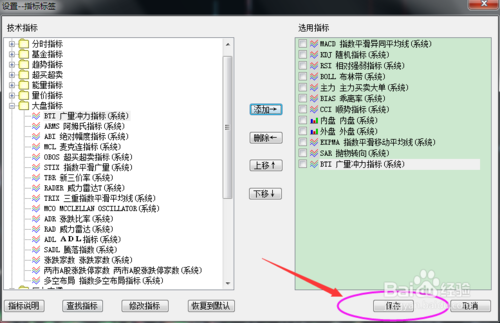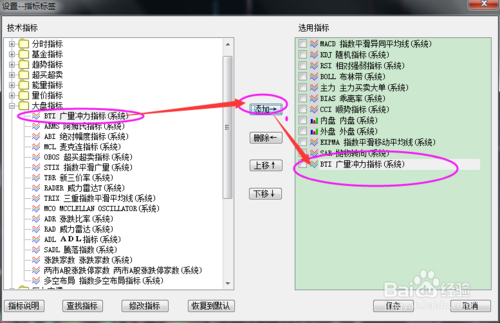 4、添加“技术指标”:如图点击你选择的一个指标,再点击添加,指标在右边(选用指标)显示。