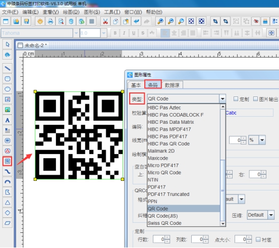 2.点击软件左侧的图形按钮”绘制二维码”,在画布上绘制二维码对象,双击二维码,在图形属性-条码中,可以设置条码的类型,这里设置条码类型为QR code.