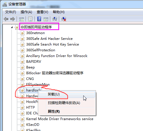 5、找到“hardlock”一项,单击鼠标右键,弹出菜单中选择“卸载”。