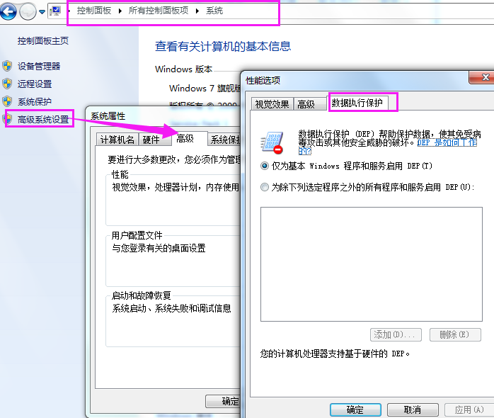 第二步、控制面板>所有控制面板项>系统>高级系统设置>高级>性能>数据执行保护设置。