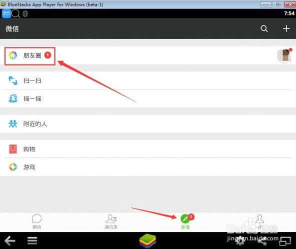鼠标双击模拟器微信图标,启动微信,如下图所示!选择上方的发现选项,如下图所示!