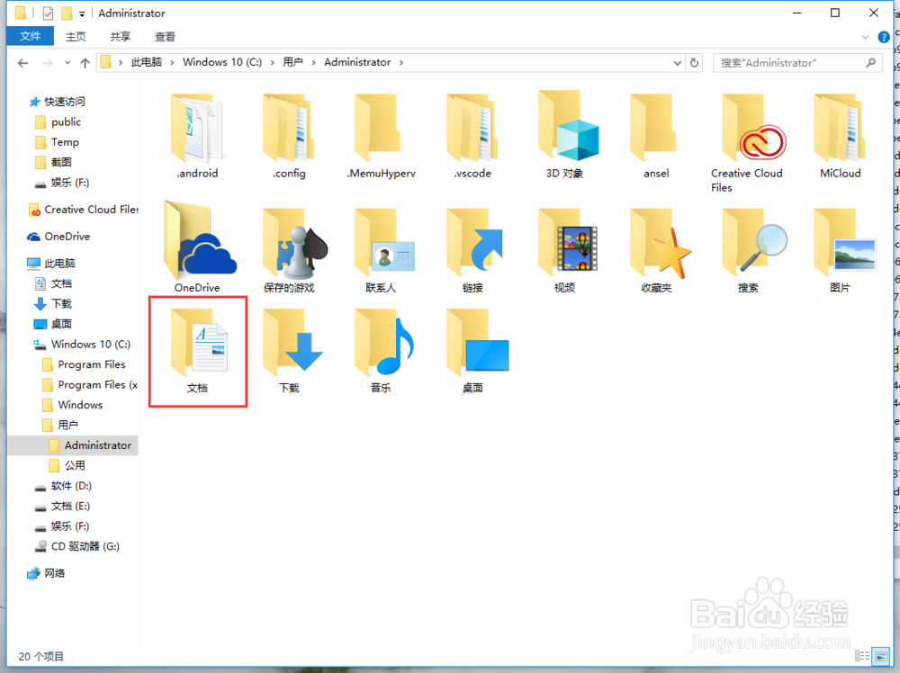 【Administrator】文件夹中,找到【文档】文件夹,双击打开。