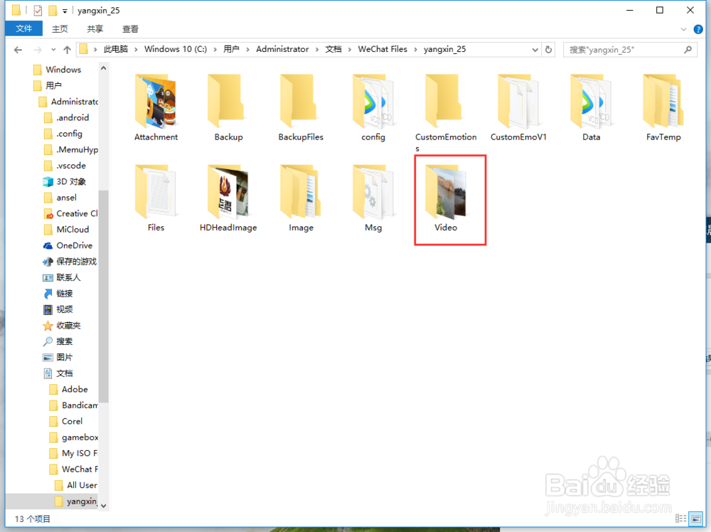 点击后会打开一个文件夹,中间位置系统默认选择的就是我们刚才在聊天窗口右键点击的那个视频,我们再看文件夹顶部的位置,这个位置就是微信电脑版默认保存视频的位置。下面我们从电脑中逐个找到存放的位置。