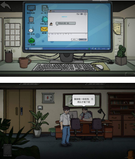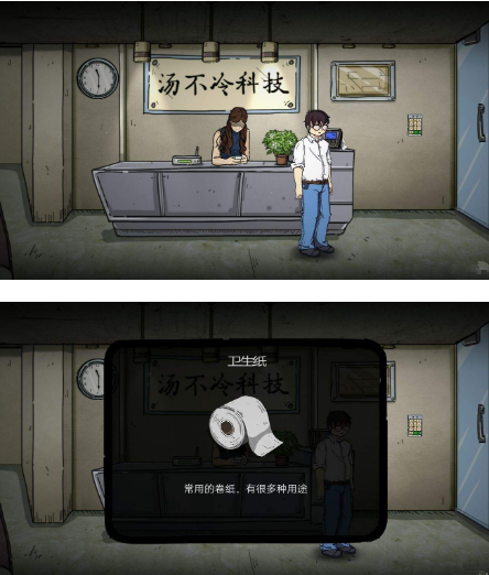 所以游戏在解谜的过程中增加了很多好玩的梗供玩家体验和发现,比如“变成蛞蝓的老板”、“办公室厕所蹲了一天的同事”、“每月准时到的借呗短信”……甚至是能够捡起来放进背包的用过的厕纸,不仅扔不掉也用不掉,在前期的剧情中也无法了解这玩意的用处,一度怀疑是制作组的恶趣味……种种槽点等玩家来解开疑惑。