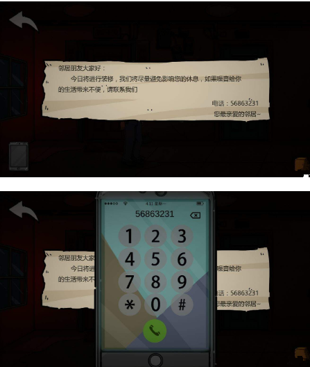 8.此时发现没有办法把盐水撒到虫子身上,根据501门口的纸条提示,她家在装修,所以给他打电话