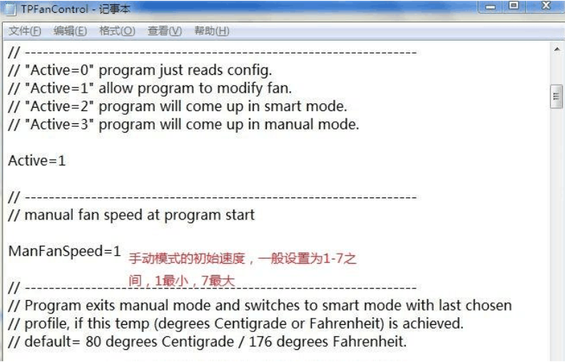 打开 tpfancontrol.ini 双斜杠 // 后面的内容是起说明作用的,不需要关心,有兴趣可以自己研究研究