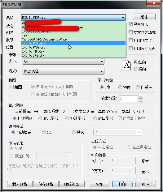 现在就可以选择打印机,进行图像转换,选择EXB to pdf(也可以选择其他格式)