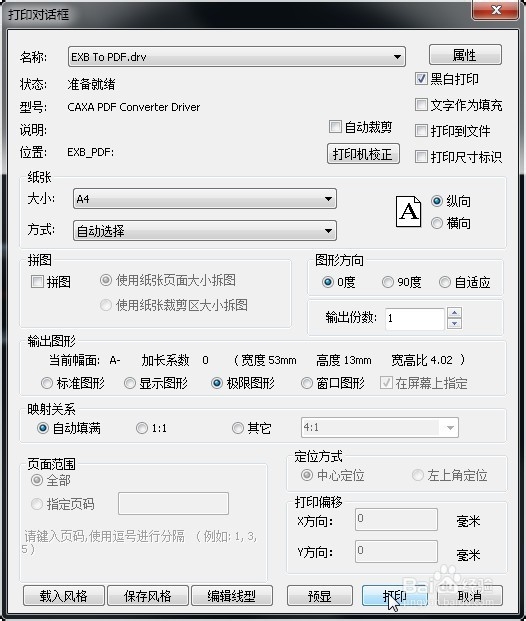 打印时不要忘记选择 输出图形 格式,一般可以选择 极限图形或者 窗口图像,再点击预览,预览后点击打印