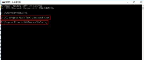 6、输入“CD Program Files (x86)\Tencent\WeChat”,进入微信安装目录文件夹,CD在命令提示符代表打开文件的意思;如图