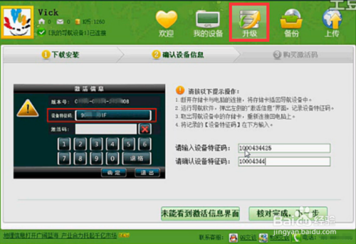 接着将导航仪SD卡通过读卡器连接到电脑上,切换到“升级”选项卡,按提示输入两次“设备特征码”。