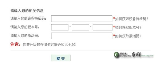 登陆“凯立德”官方网站成功后,就可以从打开的“网页升级”界面中,输入有关导航仪设备的“设备名称”、“特征码”、“版本号”和“激活码”,点击“确定”按钮,实现地图的升级操作。