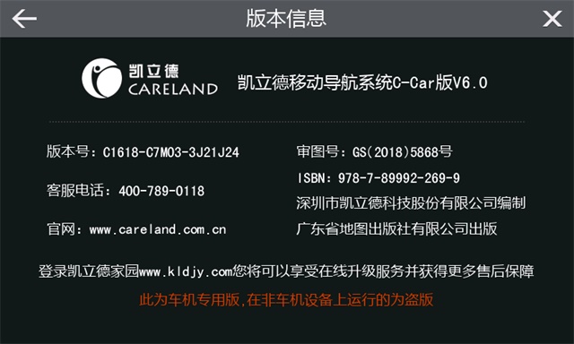 将存储卡放回硬件机器中,打开凯立德导航系统,进入【功能】->【帮助】->【版本信息】,查看版本信息,显示为XXXXX-XXXXX-2342J07(2342W07)。您已成功升级凯立德2019版。