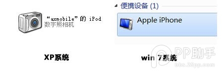 2、请确认您的设备连接电脑后,手机在充电(确保数据线良好),并且我的电脑里有iPhone特征识别“XXX的iPhone数字照相机(XP)”或者“Apple iPhone(Win 7)”。(如下图)