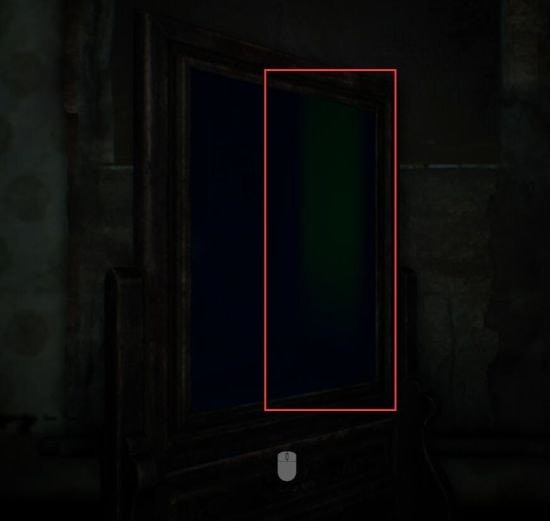 这时候去使用镜子,将手电筒关掉,左右移动镜子就会看到有绿光的门,进入显示绿光方向的门