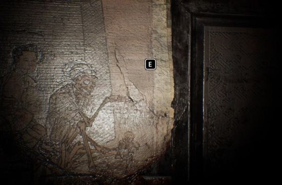 进门右前方墙上有两副挂画,与右边挂画互动可以取下挂画,再与左边挂画互动会出现缺口,然后放入炮竹(直接点会炸死自己),再将取下的挂画盖上去,用火柴点燃挂画,马上跑柜子里躲起来,爆炸会将鬼引来,等鬼脚步声消失再出来
