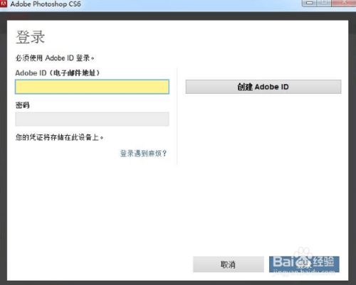 3、登录,如果没有需要Adobe Photoshop CS6的帐号需要注册,点击右侧的【创建Adobe ID】会跳到注册窗口