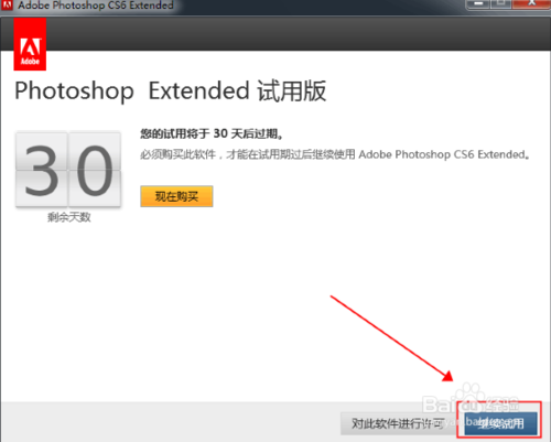 6、出现启动【Photoshop Extended 试用版】的界面(Photoshop Extended 是扩展版的),点击【继续使用】,如图