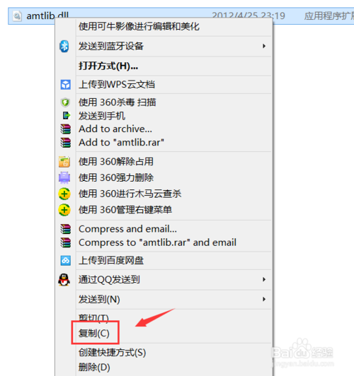 2、在amtlib.dll文件上单击鼠标右键找到复制选项,如图所示: