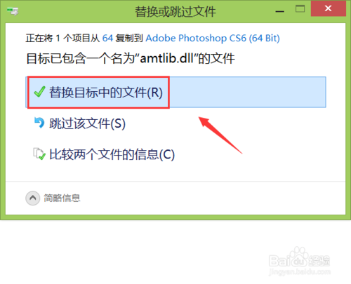 5、点击粘贴选项,在弹出的对话框内选择替换为目录中的文件选项,这样我们就为ps打好了补丁,如图所示: