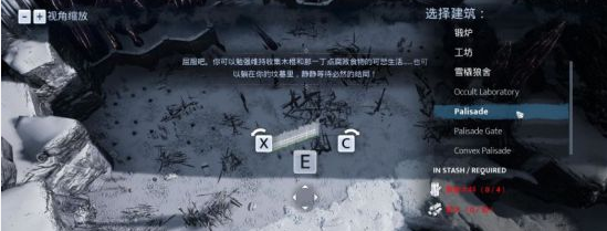 建筑工作非常简单,你只需要选好你要建造的建筑物,然后选好地址,地址上不得有其他杂物(哪怕是场景中本来已有的残垣断壁及断木),然后玩家就可以按X键和C键调整建筑物的朝向,然后按E键确认建造。