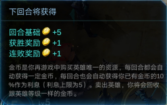 在游戏中,金币主要有两个来源。一是每回合的收入,每回合的收入=回合基础收入+利息收入+连胜奖励/连败补偿。利息收入即你结束回合时的金币的10%。利息收入最高为5,所以当你的金币囤积超过50后,尽量把这些富余的金币转化为你的棋子。