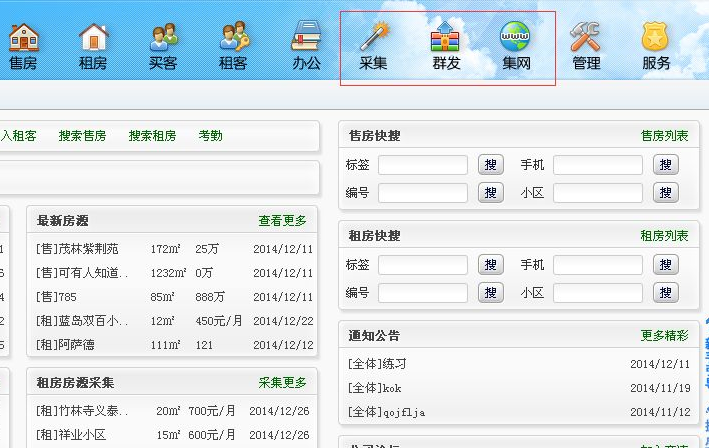 房源客源管理、任务、跟进、查重、楼盘字典、钥匙管理、超强搜索、通知、考勤、工作日志、备忘、中介黑名单、内部论坛....