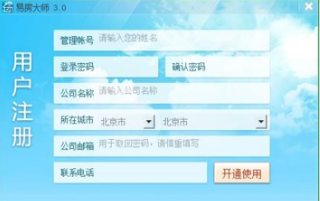 1、可打开软件登陆界面,点击下图所示按钮,进入注册页面,进行注册,按照提示将公司信息填写完整,然后点击“开通使用”,立刻进入易房大师系统!一步操作,轻松搞定!进入系统之后,系统自动为您配置角色!