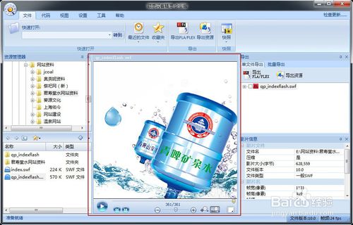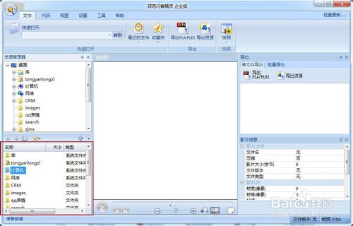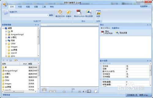 首先我们打开闪客精灵,闪客精灵的操作面板还是比较简单的,大家只需要了解基本常用功能就可以了。左上角是资源管理器,左下角是文件选择区域,中间是文件播放区域,右上角是导出信息面板,右下角是影片信息面板