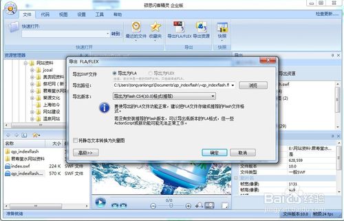 当点击导出FLASH/FLEX后,会弹出导出文件对话框,这里的选择很重要,导出路径不用说,就是文件导出后存放的位置,导出的版本选择,一定要尽量选择推荐版本,因为它会解析你的文件,推荐出制作时所用的版本。如果你没有当前版本,可适当选择较低版本,不过如果flash中含有as脚本,那么可能会对脚本造成影响。当然这里你也可以根据你的需要选择导出flex格式,高级设置一般不用改懂。