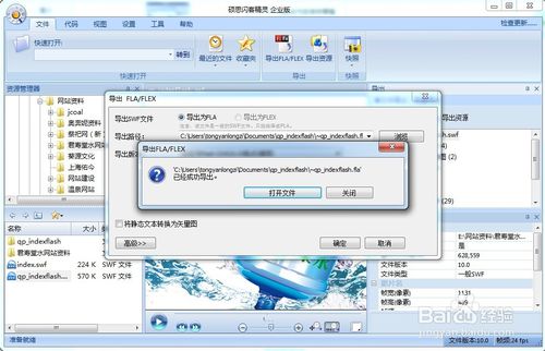点击完成后,会提示你是否打开导出的文件,如果你的电脑上安装了flash制作软件,如图中的flashcs4,那么它就会直接打开。如果暂时不想打开编辑,可以选择关闭。