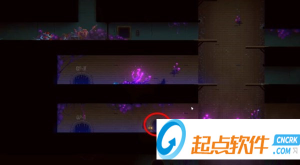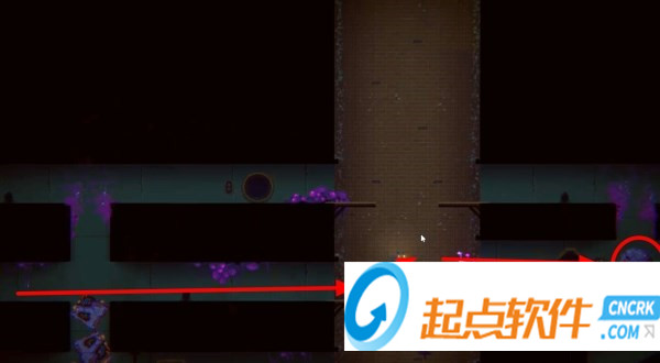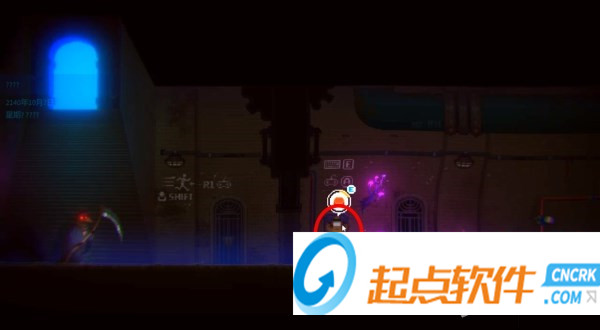了解了基本的移动操作之后,会有一个拿着镰刀的死神追我们,我们需要一直向前跑,跑到红圈标注的蓝箱位置,连续按E(手柄为A,鼠标为左键,下文所有互动均为此操作,以后不再提示按键)拉下闸门。