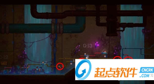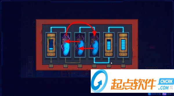 操作1号位置的供电装置,会进入解谜环节,这个方法按大小顺序从左到右排序,如果顺序正确,相连的线会亮蓝光,如果错误就不会亮。