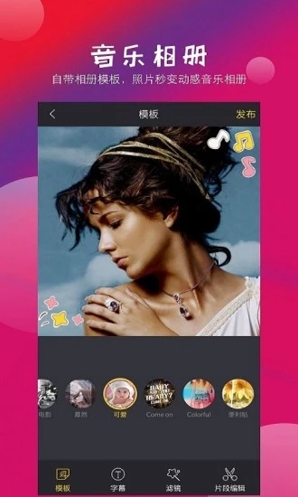 【视频主题】视频主题包含亲情、友情、爱情、萌宠、爱豆、宝贝、节日、美食、嘻哈、个性、文艺、时尚、趣味、简约、在路上、珍贵回忆、美好时光【视频滤镜】视频滤镜包含美颜、魔焰、日系、美白、怀旧、复古、Lomo、宝丽来、黑白、HDR、光晕、浮雕、素描。