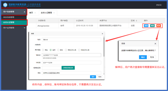 点击“体系通”的应用图标,进入“国家数字教育资源?公共服务体系”首页。在界面左侧选择→用户信息管理>实名认证管理,可以看到界面右侧出现个人认证信息,点击操作中的“编辑”或“解绑”。
