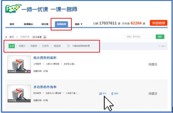 教师可查看自己的“晒课”,平台按照课例的审核状态进行分类,记录“晒课”教师的活动轨迹,便于“晒课”教师对自己的“晒课”内容进行管理。
