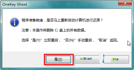 5、 然后在出现的提示界面上,选择“是”,那么就会立即开始计算机重启进行还原。如下图所示: