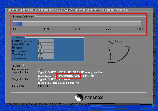 6、 重启后,那么就会进入的是系统还原,大家能看通过查看还原进度条来查看还原进度。