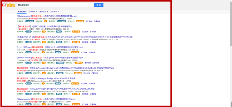 4、点击“搜索”按钮就可以马上查到所有和“复仇者联盟4”有关的影片资源。