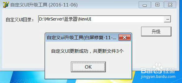 第三步:先升级一下UI,也就是打开自定义UI升级工具(白屏修复),进行升级,那么什么情况下要升级呢?要在登录器文件夹内可以看到NewUI这个文件,点击进去,如果里面有大量的Bak格式的文件,那么必须升级,没有升级进入游戏会出现白屏,特别是升级了引擎。这一步少不了,逃不掉。