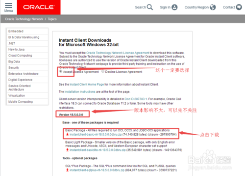 2、选择与自己系统匹配的“Instant Client”32位或者64位(首相保证:和Navicat Premium 12的位数相同,如Navicat Premium 12为32位的“Instant Client”也要选择32位否则无效)。